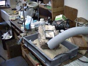 石に包まれている化石を研究するためには包んでいる石を丁寧に削り落とさなければなりません.そのための装置があるのがこの部屋です.右側に見えているのは飛んだ粉塵を吸い込むバキューム.この他に細かな砂を吹き付けて磨きだす装置などもあります.また放散虫などの微化石を岩石から取り出すための薬品処理ができるドラフトチャンバーもあります.この他にも地学系の実験室として岩石カッターのある石工室・化学分析室があります.