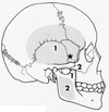 ●1は「側頭筋」(そくとうきん)という筋肉のついていたあとです.