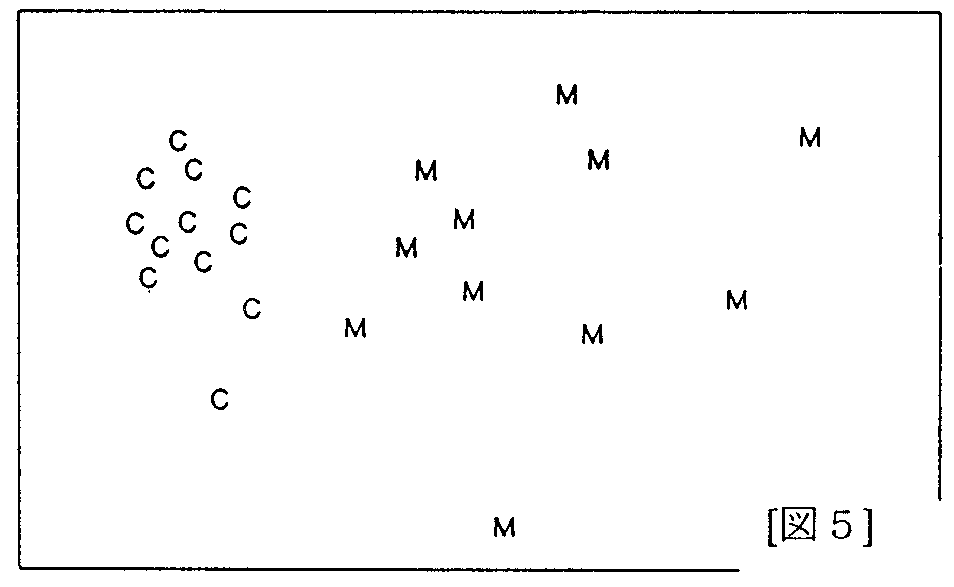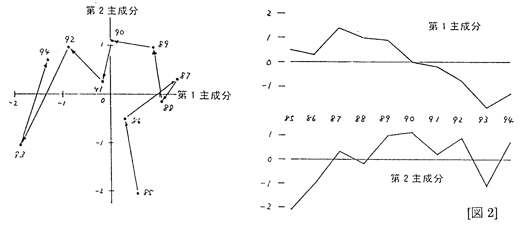 (Z1I−ZmI)2 + (Z2I−ZmI)2 + … + (Z5I−ZmI)2 が最大ここにZmIはZ1I, Z2I … Z5Iの平均であって、(Z1I−ZmI)2,… は偏差平方、これをたし合わせて全体のばらつきの指標となる。第2主成分以下も同様に{LIIA, LIIB, … LIIJ}{LIIIA, LIIIB, … LIIIJ}などを定めてゆくが、これらについては先の二つの条件のほか、その主成分が前のすべての主成分に対して独立であるために、ZII, ZIII… 軸が、前のすべての軸に直交する、という条件が加わる。そしてこのLの列の組、つまり、