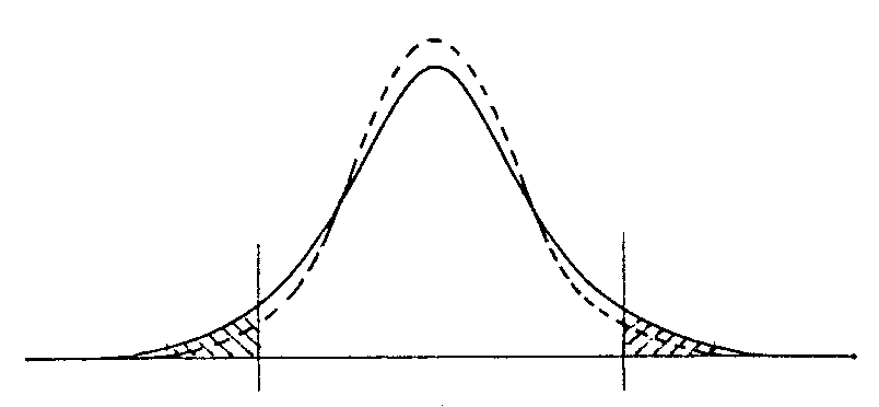 | 図2.理論的なt分布(実線)と、interspersionによって変形したt分布(点線)。斜線はP<0.05の棄却域。 |