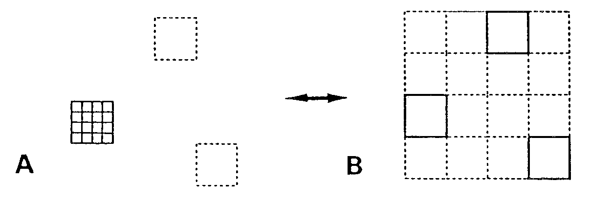 | 図1.コドラート配置の様々な例。Aが好ましい配置、Bは'pseudoreplication'(Hurlbert 1984) |