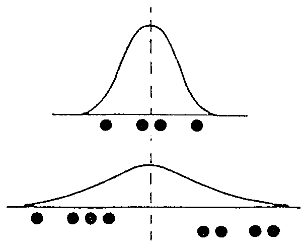 | 図1.分散の異なる2母集団と標本の位置との関係。