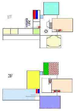 博物館には4つの収蔵庫があります.2Fの紫で示した部分と,さらにその上の3Fの部分に2部屋づつあります.ピンクの第二展示室から階段を上がってすぐ,2階のギャラリー展示の間に見える扉がそれです.