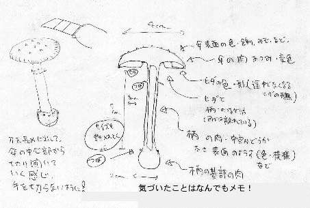断面のスケッチは肉の厚みやひだの傘や柄とのつながり方が良くわかります.ひだの色にも自然と眼がいきます.また,柄が中空になっていたり,柄の根本だけ肉の色が変わっていることに気がつく場合もあります.図鑑の絵がしばしば断面図で載っているのはこうした特徴を示すためなのです.伏せた方は傘の表面(溝や毛),柄の模様,つばやつぼの様子に気を付けて記録しましょう. スケッチは上手な絵でなくても,所々にコメントを書き込んで置けば特長がよくわかります.色も水彩画で描ける人は別として,無理なら絵の脇に「傘の中心部は赤紫,周囲は淡い赤」「柄は光沢のある白,下部に一部赤み」などと書き入れていくだけでもないよりよっぽど助けになります.さらに余裕があれば胞子紋もとってみましょう.胞子の色は自分で種類を調べるときに大きな参考になるはずです.胞子紋は切り取った傘を紙の上に伏せ,コップを上からかぶせ,一晩おいておきます.キノコの部分や形を示す用語は,たいてい図鑑の一番最初のあたりに書いてありますから参考にしてください.