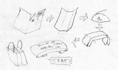肝心の採集道具は,根掘り,もしくはナイフがあればいいでしょう.木材腐朽菌を専門に集める人はなたやノコギリ,地下生菌を集める人はスコップやくま手と,それぞれ目的にあわせて装備が変わります.採集したものを個別に入れる小さな紙袋か新聞紙を折ったもの(左図),採集品を運ぶための篭か手提げの紙袋が必要です.ビニール袋では蒸れてすぐにキノコがダメになります.小さな紙袋は包装用品の店に行けば売っていますが,手には入らない場合はこの図のような新聞紙を用意しておけばいいでしょう.手提げのかごや袋は形を壊さないで持って帰るためには重要です.ザックの中ではまず間違えなく壊れます.