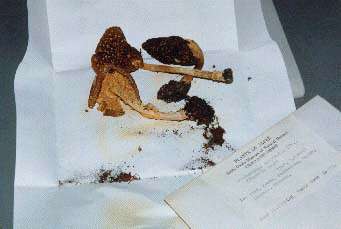 大阪市立自然史博物館では今の所キノコの標本は乾燥標本としてつくっています.植物のさく葉標本にも使う大型の送風乾燥機でつくっています(右の図:テングタケ).完成品はいわば「干しシイタケ」の様な状態になるので,色や形はもとの状態と大きく変わってしまいます.しかし,それでも研究者にとっては形の特徴が押さえられ,胞子の顕微鏡観察も可能です.採集したキノコはそれぞれ小袋に入れられ,袋自身が仮のラベルとしてデータが書き込まれています.入れ替わらないようこのままの状態で乾かします(状態によっては袋の上にのせて乾かしています).送風乾燥機の温度は50度に設定しています.送風乾燥機を使うのは,水分の多いキノコを蒸らさずにすばやく乾かすためで,だいたいほぼ一晩で乾きます.
