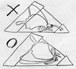 蝶や蛾など,鱗粉があるものは,胸を押さえて殺したあと,三角紙に挟み,三角缶に入れて持ち帰ります(図6).トンボなども同様にしますが,腹がくさりやすいので,三角紙に生きたままはさみ,餓死するのを待ちます.そうすると,腹部が空の状態で標本を作ることができ,腐りにくくなります.