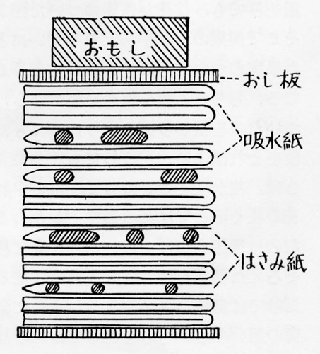 標本にする植物を全てこのようにはさみ紙にはさみますが、まず押し板を置き、吸水紙を1〜2枚置きます。その上にはさみ紙を置き、植物をはさみ、必要事項を書きます。その上に吸水紙を1〜2枚置き、またはさみ紙を置きます。このようにはさみ紙と吸水紙をかわるがわる重ねていきます。はさむ植物の茎が太くてごろごろするときや水分の多いときは、その前後に吸水紙をたくさんはさみます。一般に吸水紙をたくさん挟んだほうが早くきれいにできます。太い部分が1箇所に集まらないように気をつけ、水平になるように積んでいきます。30cmくらい積み上げたところで押し板をのせ、おもしをします。あまり高く積みすぎると押している途中で倒れてしまいますから注意しましょう。