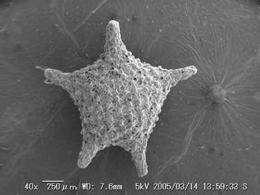 星の砂の元は海に住む有孔虫。大きくすると表面にはたくさんの穴があいているよ。