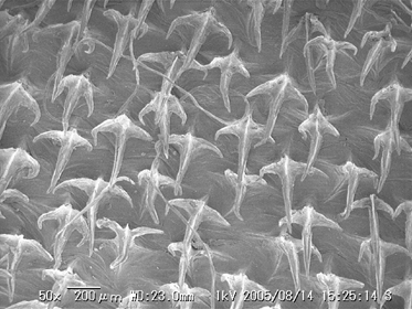 ヘラツノザメというサメの肌です。矢印のような突起物があるよ。