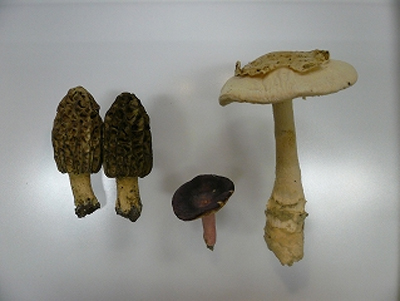 左から、トガリアミガサタケ、ムラサキカスリタケ、シロテングタケ