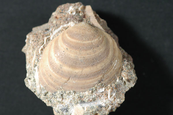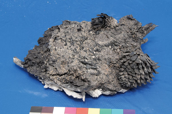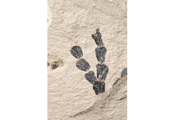 | オオミツバマツの球果の産状を示す標本.鱗片の先が刺のように出っ張る.中新世後期.岐阜県多治見市.長さ9cm. |