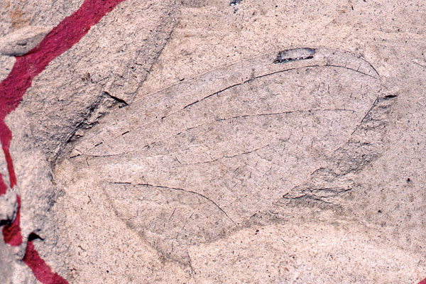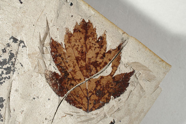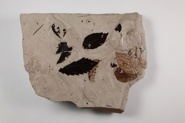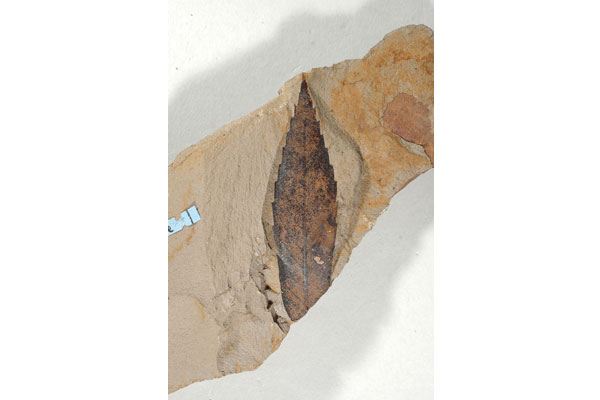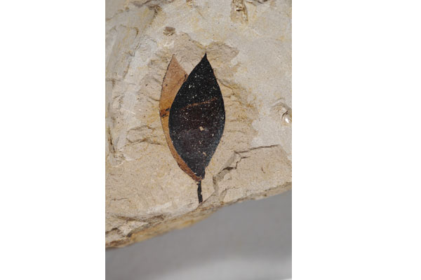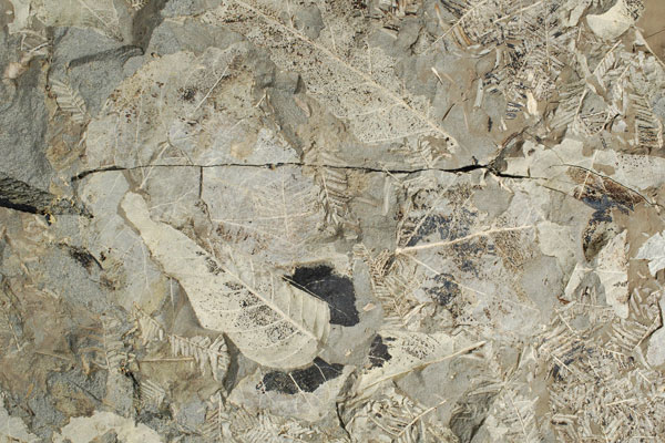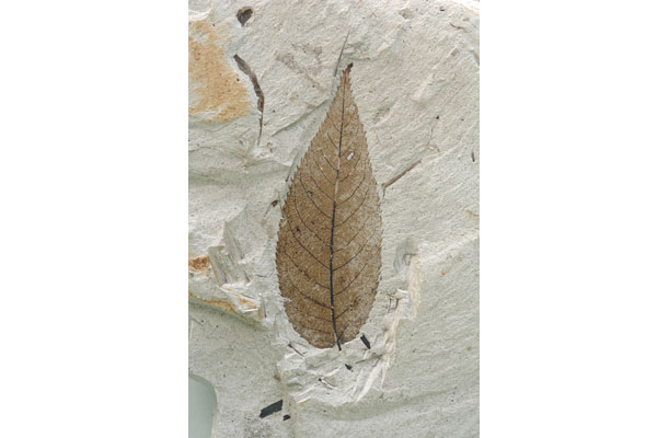 | 近接していてもこのように保存状態が異なる.ユリノキ属とイヌカラマツ属は現在日本には自生しない.中新世後期.鳥取市佐治町.ブロックの幅35cm. |