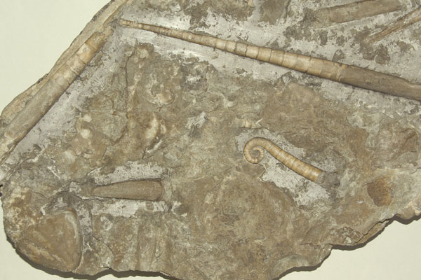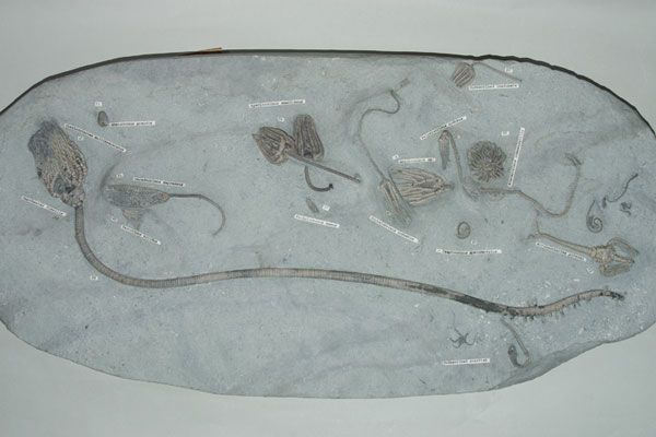古生代初期の生物界を特徴づけるのは、体制の大型化、カンブリア紀爆発とも表現される急激な多様性の増加、それに伴う生活様式・生息場所の多様化、そして固い殻を持った動物の出現です。多様性が増加したことによって食性も多様化して、生物種同士に食う・食われるという関係が始まり、食う側の武装化と食われる側の防御目的などが固い殻を持つ動物の出現を引き起こしたと考えられています。