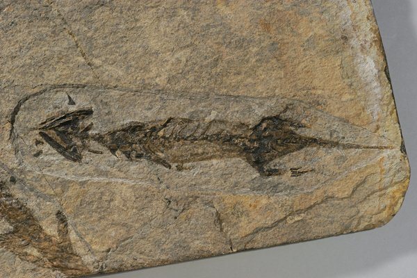 両生類はデボン紀後期に、肉鰭(にくき)類と呼ばれる魚の仲間から進化しました。肉鰭類は、水中呼吸用のえらだけでなく、すでに水上で呼吸ができる肺を持っており,水中ではバランスを取るための器官であった鰭(ひれ)のうち、胸びれと腹びれを体重をささえると共に体を前進させるための器官に変えることで、陸上への進出を果たしました。両生類の上陸により、脊椎動物は陸上で新しい進化の道をたどっていくことになります。