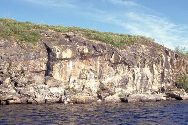 | 世界最古の岩石が露出するカナダ北西準州のグレートスレーブ湖.40億年前.カナダ.神奈川県立生命の星地球博物館写真提供. |