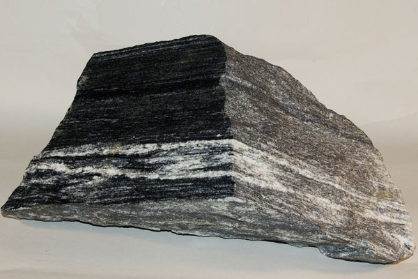 | 花こう岩のなかま(トーナル岩)が変成した片麻岩で,大陸地殻をつくる岩石では現在地球最古の岩石.40 億年前.カナダ.幅37cm.神奈川県立生命の星・地球博物館所蔵. |