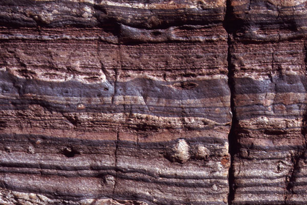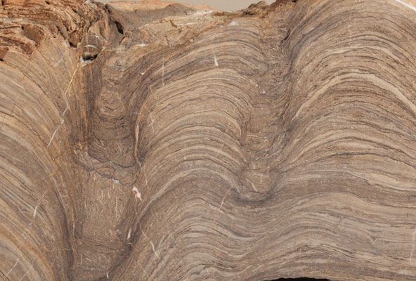 | シアノバクテリアがつくった岩石.地球大気の酸素を生み出した.先カンブリア時代.カナダ.断面の高さ36cm.神奈川県立生命の星・地球博物館所蔵. |