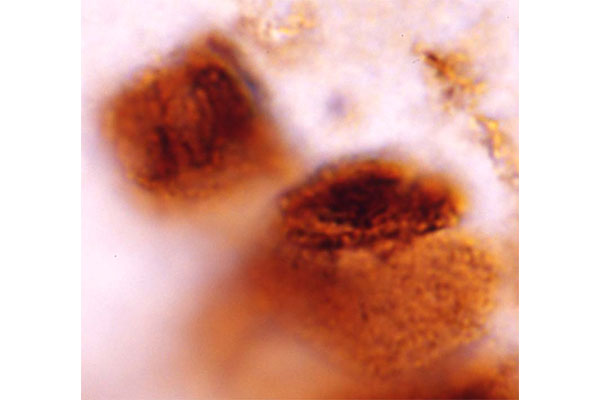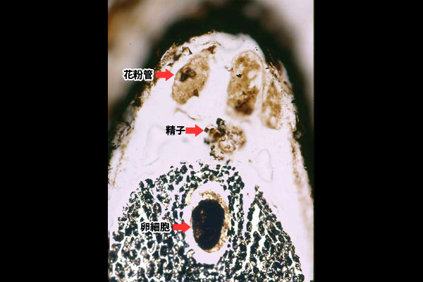 シダ植物や裸子植物のイチョウとソテツは精子で受精することが知られています。古生代ペルム紀の裸子植物であるグロッソプテリスの珪酸分に置き換えられた化石から精子の化石が発見されました。このことは、化石が珪酸分へ置換される過程は、それほど長い時間がかからないことを示しています。まさに受精直前の「瞬間を記録した化石」と言えます。写真提供:西田治文氏。