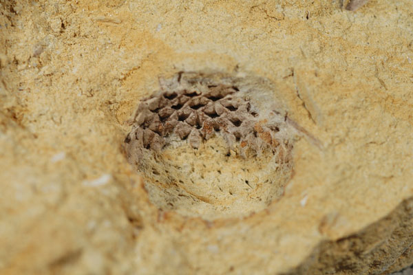 | ドングリのお椀そのものは消失して、突起の痕が穴として残っている.このような生物の体の痕も化石である.更新世.岸和田市.横幅2cm. |