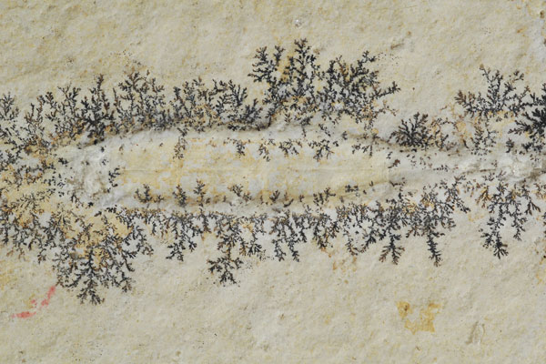 | シダ植物の葉のように見えるが,岩石の隙間に二酸化マンガンが浸みだして結晶になったもので,化石ではない.ドイツ.ジュラ紀.写真の幅約10cm. |