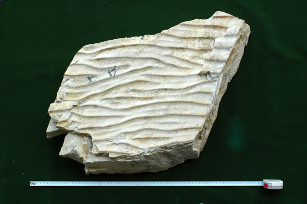 | 波浪により海底面にできた凹凸が地層として残されている.波は生物ではないので,化石ではない.先カンブリア時代.ネパール ガンダギ地方.標本の幅約60cm.神奈川県立生命の星・地球博物館所蔵. |
