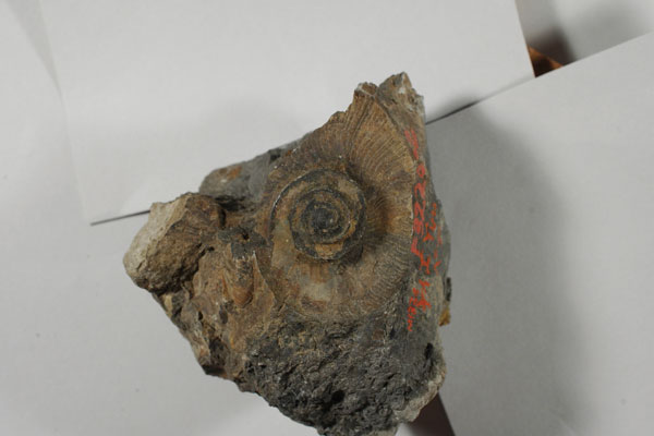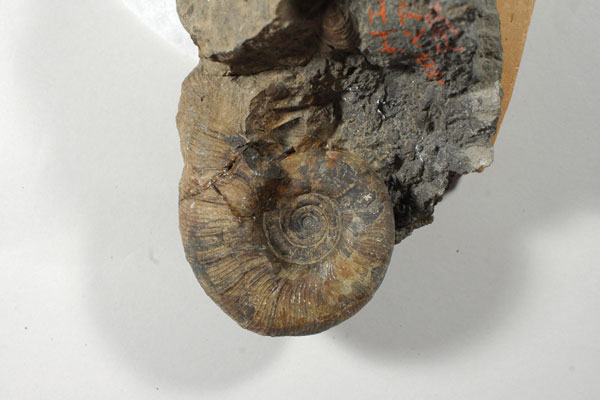 | 右のアンモナイトの殻の模様が岩石に残されている.白亜紀.北海道美唄市.幅6.7cm. |