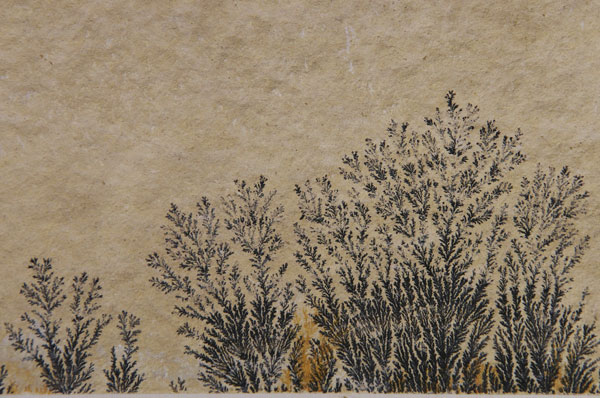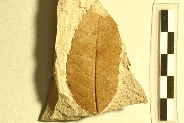 | 左の画像と岩石を割ってできるペアの化石.左の葉の葉脈の部分はへこんでいるが,右の葉脈の部分は出っ張っている.葉脈は葉の裏側に出っ張るので,左は葉の裏側の葉脈の痕を記録した化石.中新世後期.鳥取県佐治村.長さ5cm. |