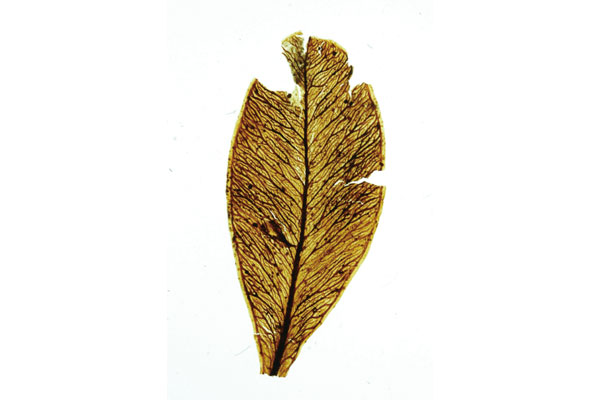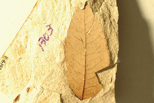 | この画像と右の画像は,岩石を割ってできるペアの化石.左の葉の葉脈の部分はへこんでいるが,右の葉脈の部分は出っ張っている.葉脈は葉の裏側に出っ張るので,左は葉の裏側の葉脈の痕を記録した化石.中新世後期.鳥取県佐治村.長さ5cm. |