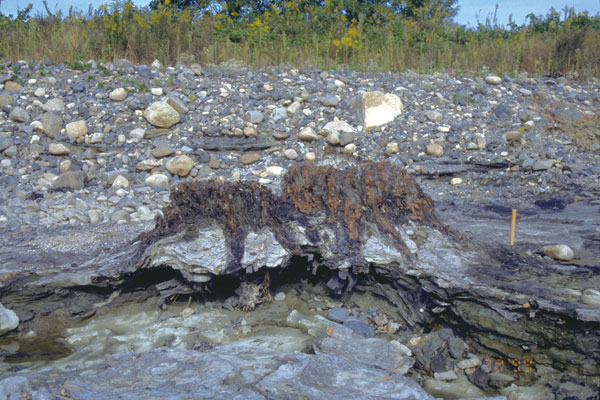 | 地層の中に根を張って,木の株の化石がある.過去にこの場所にはえていたことを示している.更新世.滋賀県湖南市.幹の直径2m. |