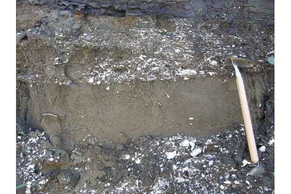 | 異地性の貝化石.水の流れによって貝化石が集められている.更新世.北海道幕別町.貝化石を含む地層の厚さ27cm. |