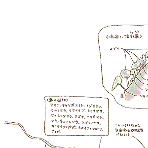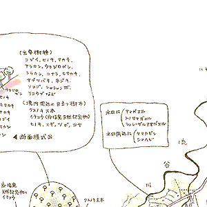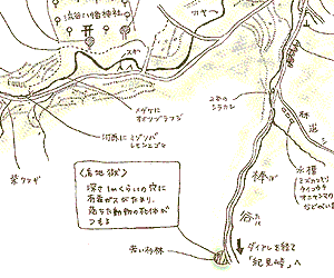流谷八幡神社の照葉樹林や「出合」周辺に広がる棚田の土手の里草地など集落周辺の自然を満喫して、大阪南部有数の林業地の様子を見よう。棒谷には有毒ガスが湧いている穴=「鳥地獄」があり、中には鳥や昆虫の死骸が積もっている。蟹井神社の奥の谷には、夢のような山村の風景が続く。