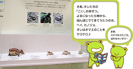 カエルはいつでも水辺にいるというイメージがありますが、多くのカエルは、林の中など水辺から離れてくらしています。そんなカエルでも産卵期には、水田などの水辺にやってきます。夜、水田から聞こえるカエルの声は、メスを求めるオスの声です。そして、産卵期が終われば、再び周辺の林などでくらします。