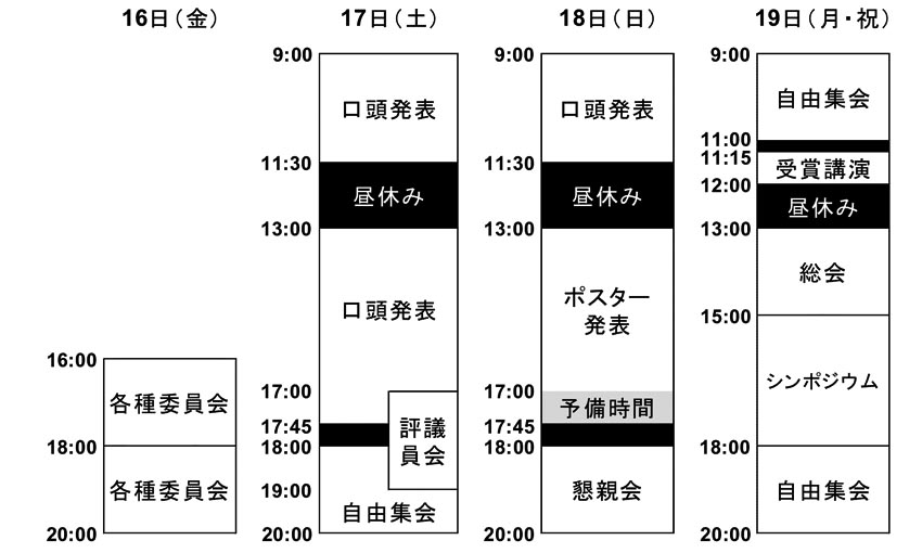 本年度大会でも、口頭発表をされた方は直後の発表の座長(司会進行)を担当していただきます。ご自分の発表後が休憩時間の場合は、休憩後最初の発表を担当してください。みなさまのご協力をお願いいたします。