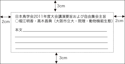 1行目には演題を書き,次の行に講演者氏名を書いて下さい.1行空けた後に本文を書いて下さい.演題と講演者氏名は申し込み用紙に記入したものと一致するようにして下さい.共同発表の場合,演者の氏名の左肩に○印をつけて下さい.要旨・主旨は情報が正確に伝わるように心がけて下さい.最終的にはB5版に縮小コピーして要旨集とすることを考慮して,文字サイズ・レイアウトをお決め下さい.図表も入れられますがきれいに刷り上らない場合があります.