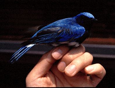 春と秋の渡りの時期には、オオルリはよくかすみ網にかかります。でも雌や幼鳥が多く、こんなにきれいな雄の成鳥は稀です。