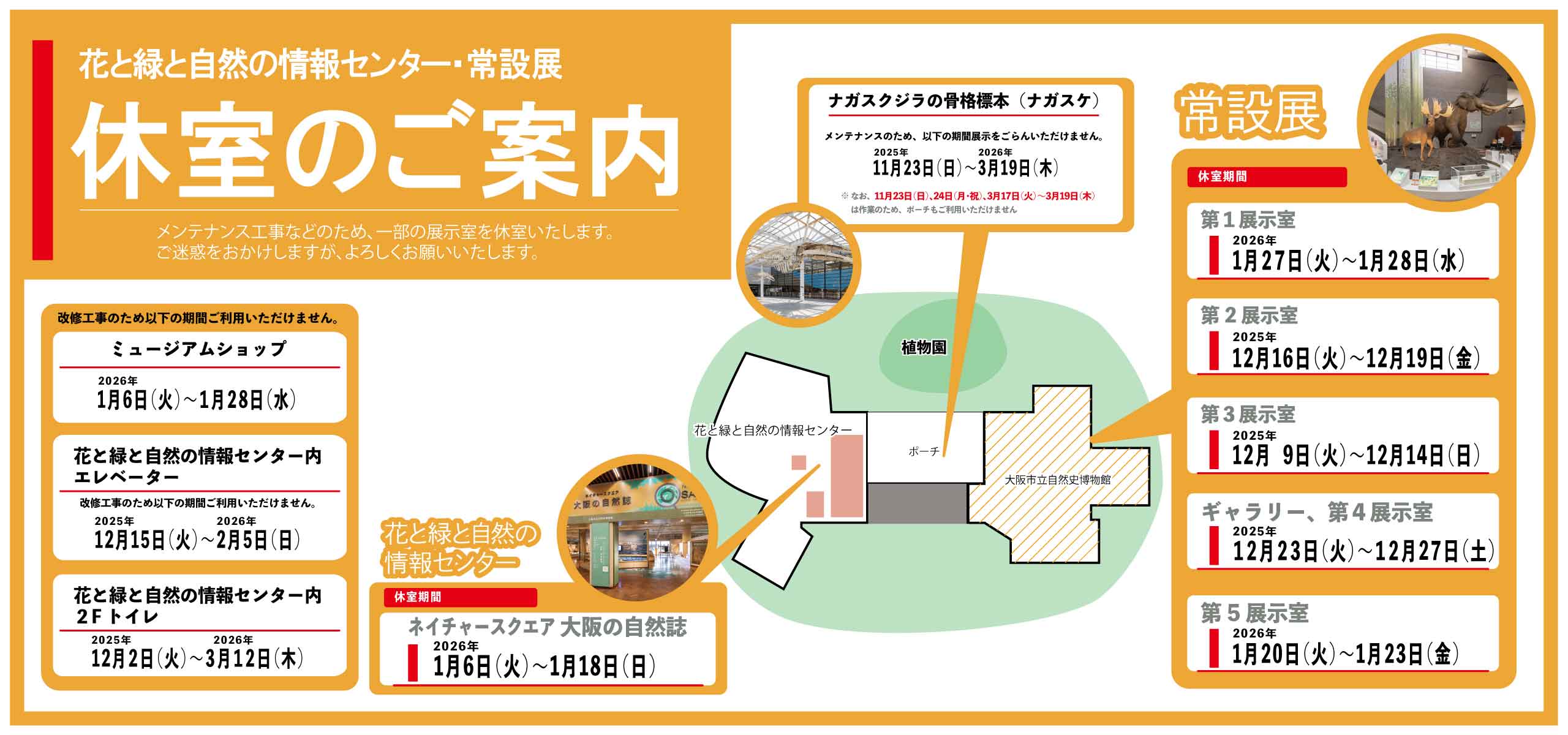- メンテナンス工事などによる休室のご案内メンテナンス工事により展示室など一部ご利用いただけない場所があります。 工事期間中は騒音等の発生によりご来館のお客様には… 続きを読む: メンテナンス工事などによる休室のご案内
