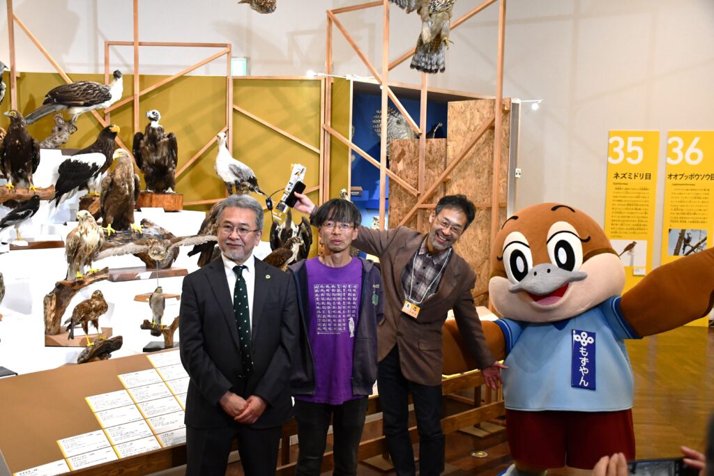 写真は3月13日に行った内覧会の様子。左から大阪市立自然史博物館 川端館長、大阪市立自然史博物館 和田主任学芸員、国立科学博物館 西海研究主幹、大阪府広報担当副知事 もずやん