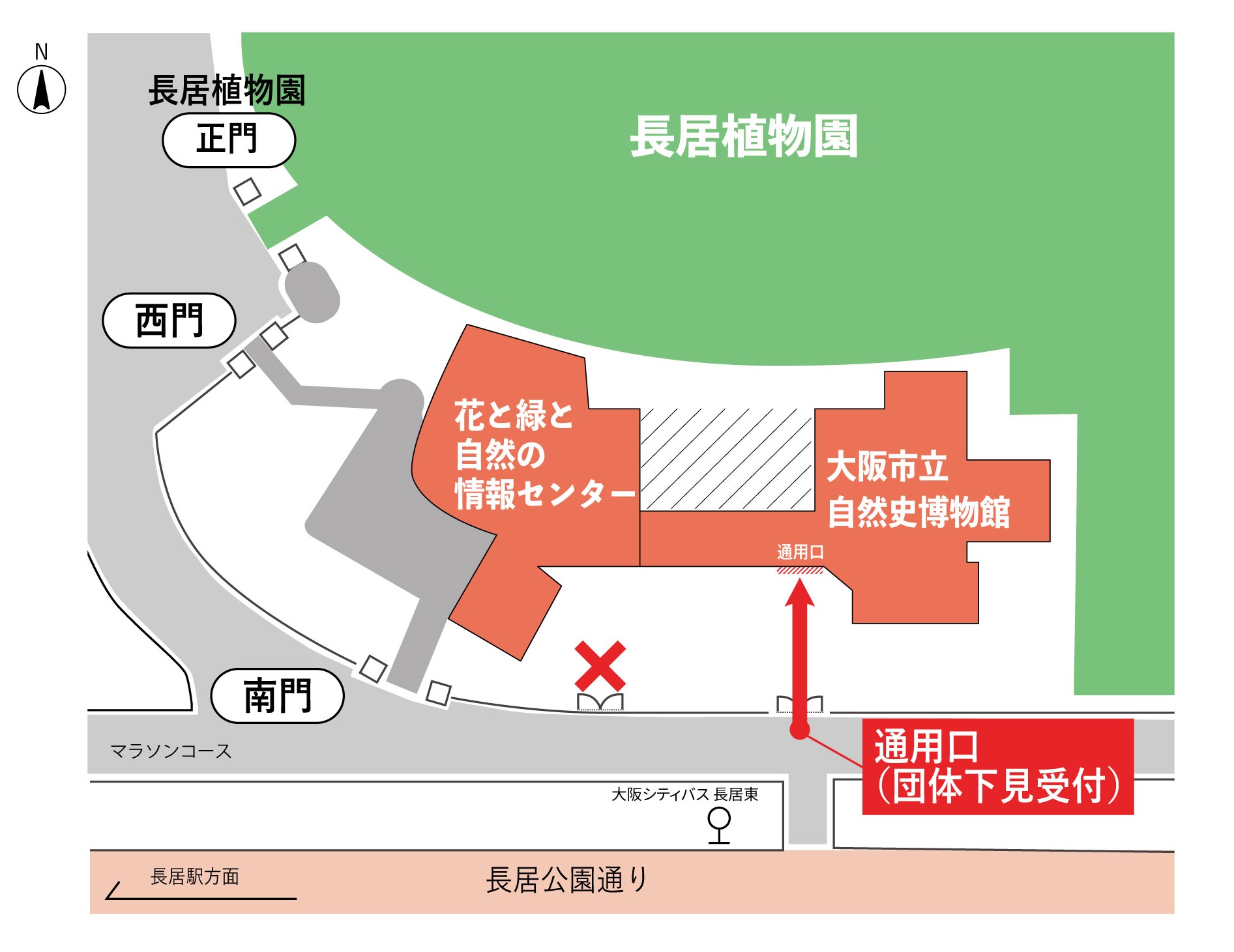 ●下見へは長居公園の南側をマラソン道路沿いに進んだ博物館事務所通用口からご来館ください。