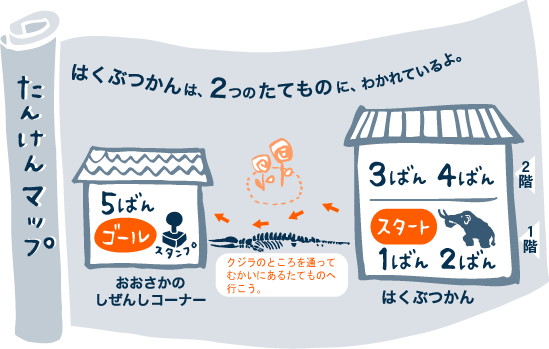 博物館は2つの建物に分かれているよ。両方の建物に行かないと、クイズの答えが全部わからないよ。