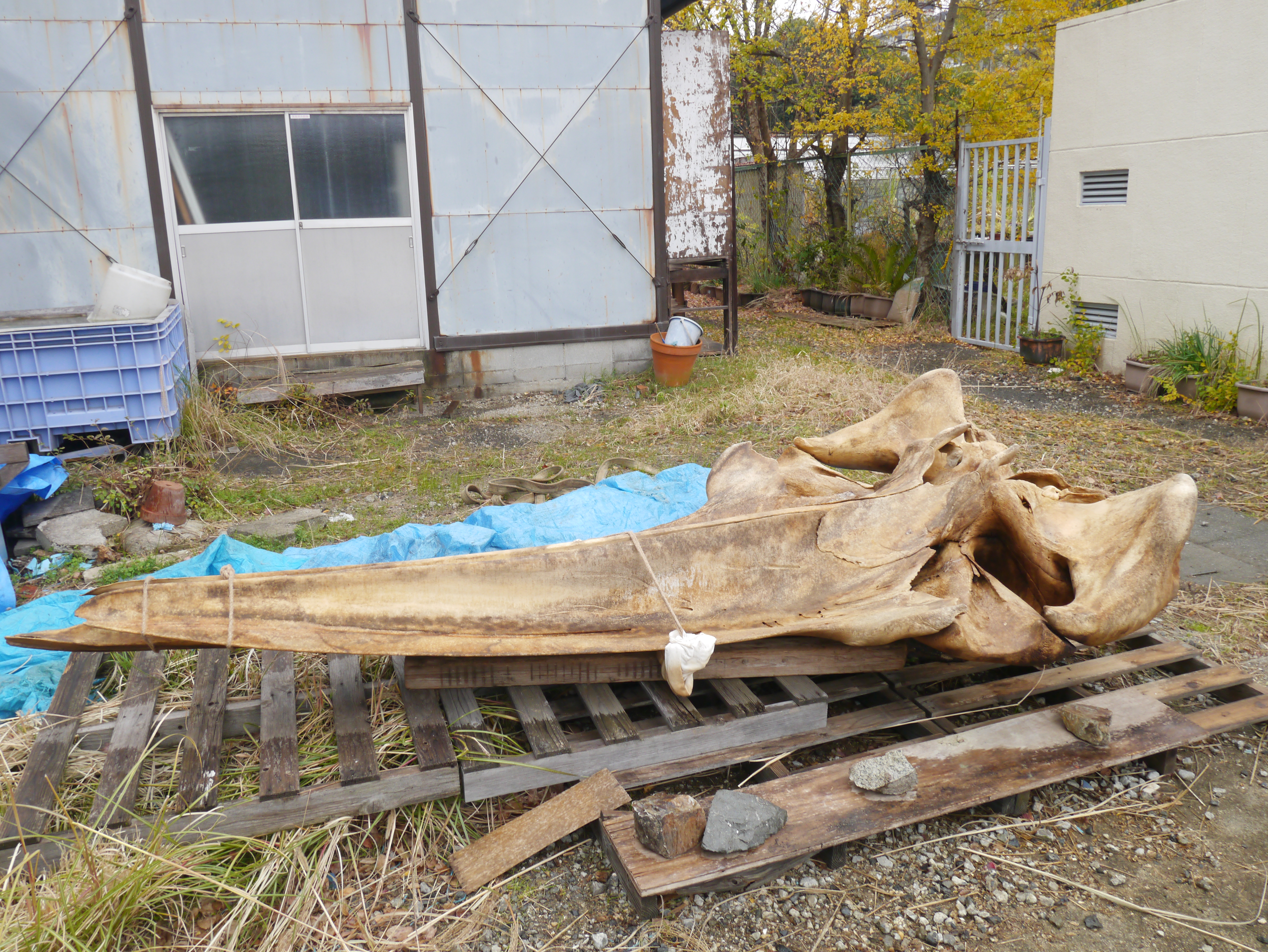 写真は2021年(令和3年)7月に、死体が大阪湾をただよっていたニタリクジラを、堺の埋立地に陸揚げして解体したのちに、自然史博物館に運んで、骨格標本に仕上げたものです。