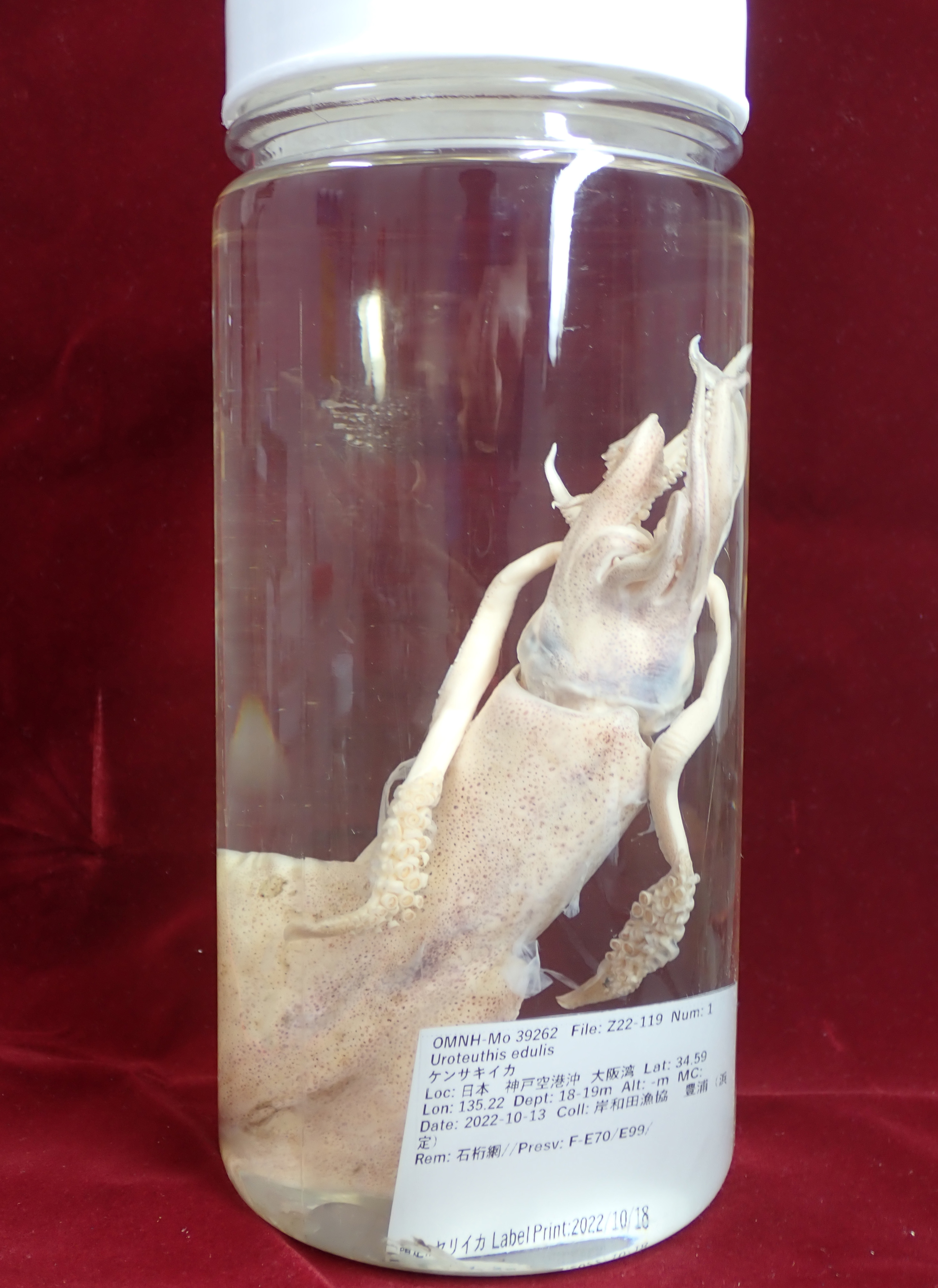 写真は大阪湾産のケンサキイカの液浸標本です。