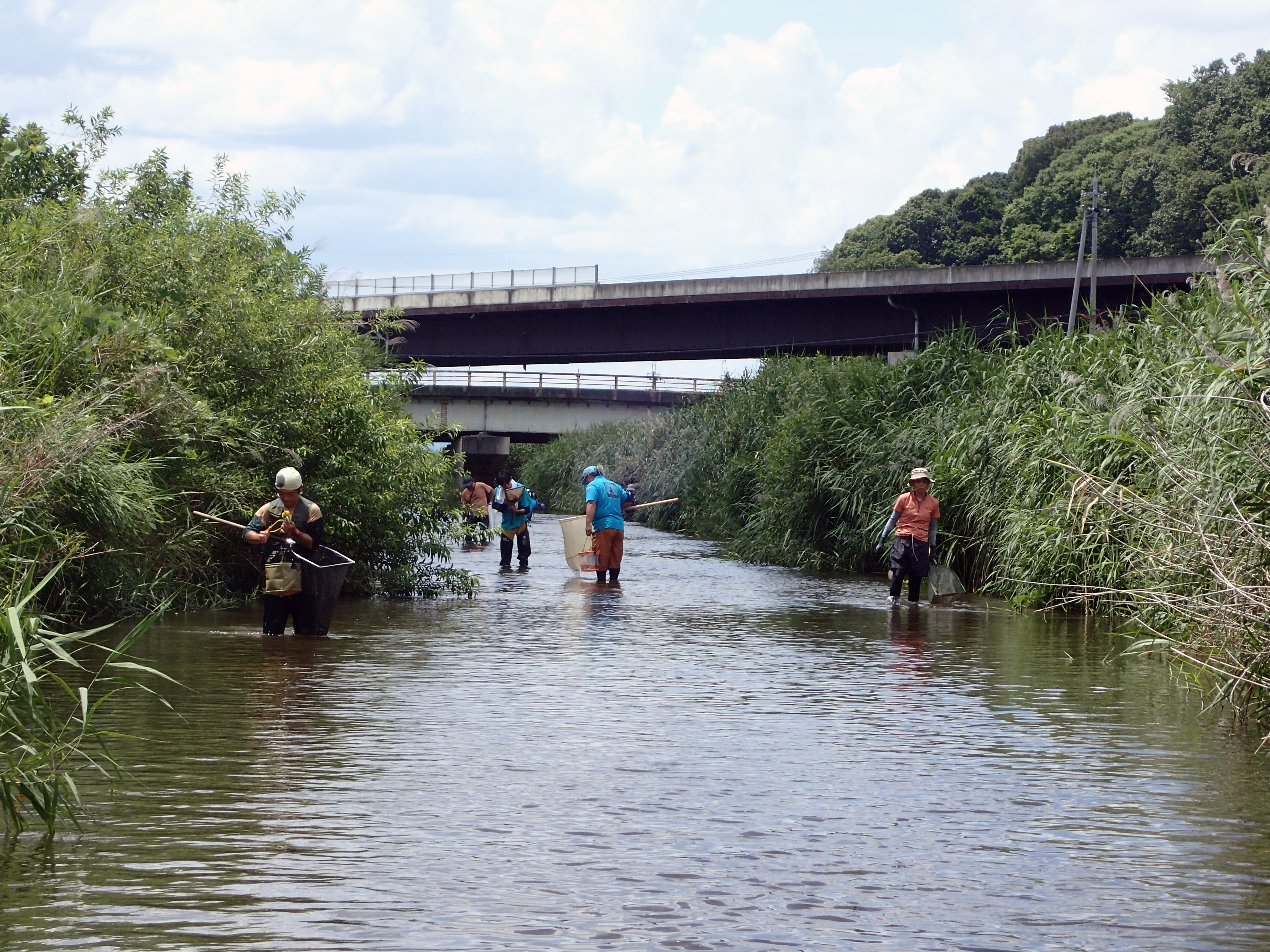 写真は自然史博物館で現在行っている市民科学による大和川水系調査プロジェクトYによる魚班の調査風景。