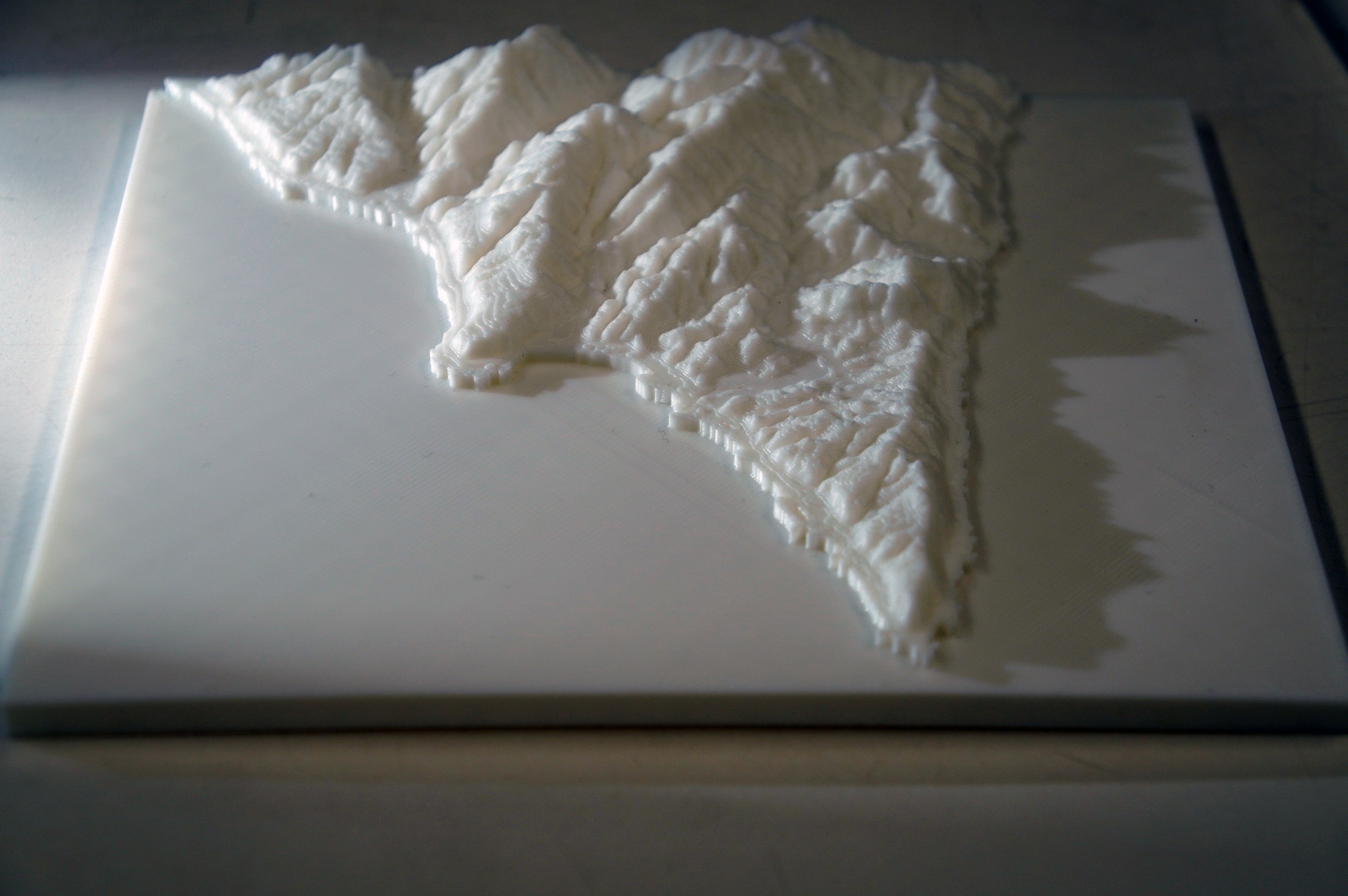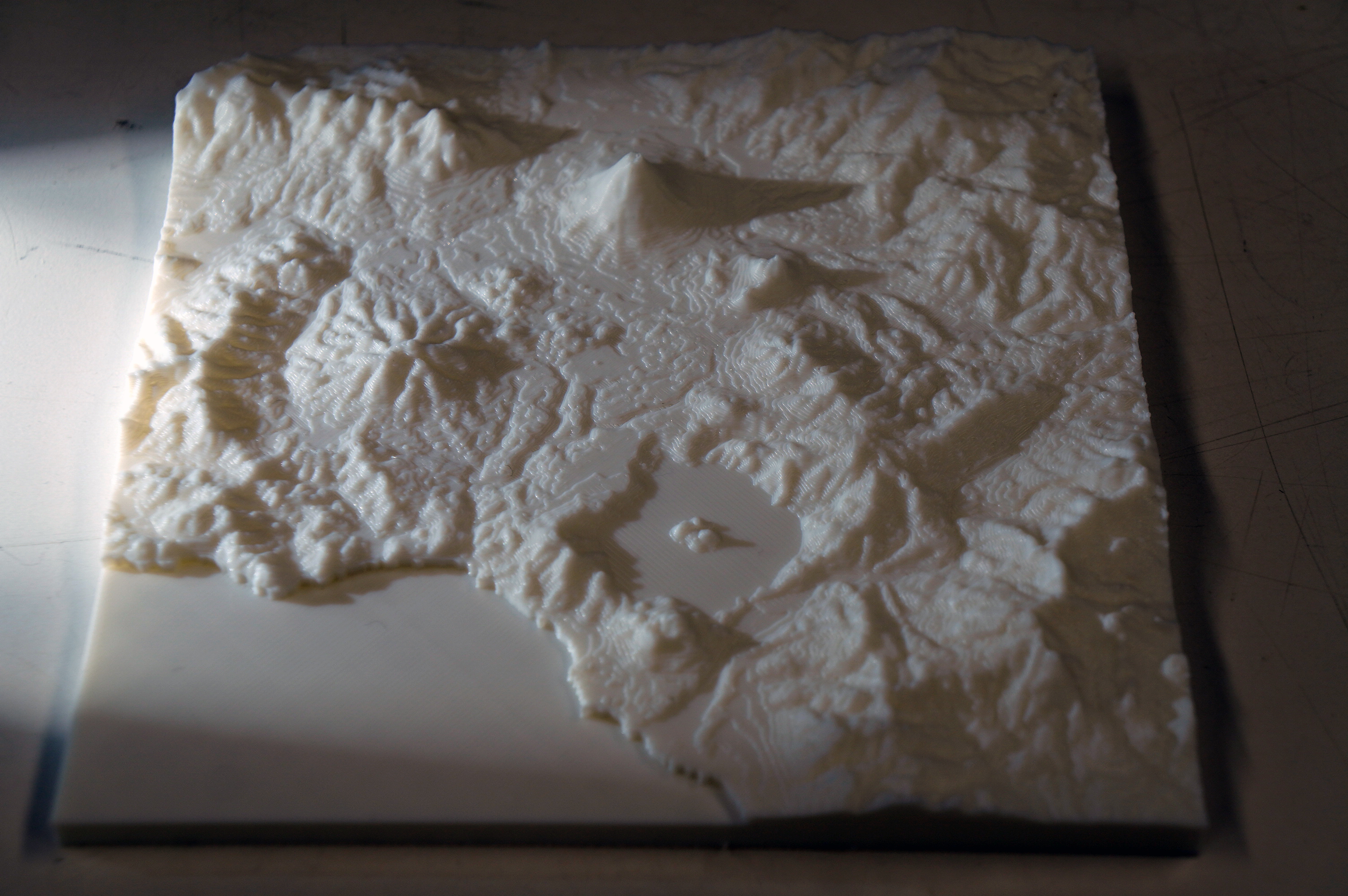 写真は、地理院地図の3Dデータを元に作成した高知県室戸岬周辺の地形模型[12]、北海道の羊蹄山から洞爺湖、有珠山周辺の地形模型[13]です。