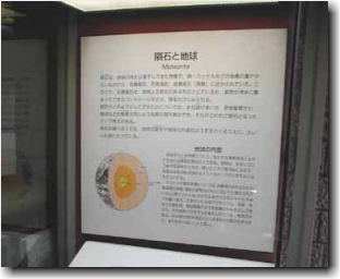 隕石は、地球の外から落下してきた物質で、鉄・ニッケルなどの金属が少ないものから、石質隕石、石鉄隕石、鉄質隕石(隕鉄)に区分されている。このうち、石質隕石は、地球上の岩石のあるものとにているが、鉱物が球状に集まってできたコンドルールなどは、隕石だけにみられる。 隕石がどのようにしてできたかについては、まだ謎が多いが、原始星雲から、地球などの惑星と同じような隕石母天体ができ、それがこわれて隕石となったという考えがある。 隕石を調べることは、地球の誕生や地球の内部のようすをさぐるうえに、たいへん役にたっている。 |