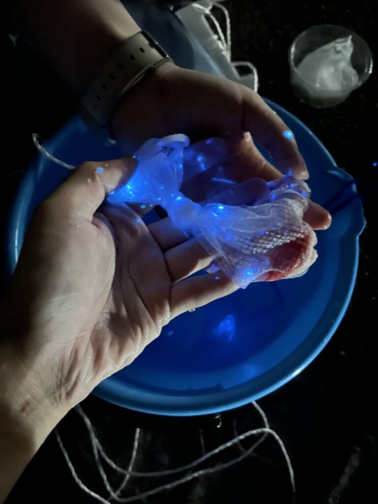 今回のウミホタルの観察はとても楽しく、たくさんの学びがありました。あんなに小さな体で、美しい青色の光を放つことができるというのは、本当に不思議で驚くべきことだと思いました。その発光の力を、将来何かに応用して新しいものを作ることができるのではないかとも感じました。また、ウミホタルは死んだ魚を食べる「海の掃除屋」としての役割を持っていることも知り、自然界のバランスを保つ大切な存在であると分かりました。少し酷な考えかもしれませんが、人間の死体までも分解できるのだろうかと想像し、生き物の営みの奥深さに考えさせられました。今回の観察を通して、海の小さな生き物のすごさや自然の仕組みの不思議さに改めて感動しました。