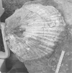 上の写真は,北海道で泊まった旅館の玄関口にあった化石です.たいへんみごとなので,写真をとらせてもらいました.旅館の人にうかがうと,道路工事にきているお客さんが,現場で見つけ,おみやげにするために置いてあるということです.その北海道の人はホタテガイの化石だと言っていたそうですが,ホタテガイの特徴である耳という部分がないので,私は,大型のカキのなかまだろう,と言ってしまいました.さすが北海道のカキは大きい?! ホタテガイもカキも二枚貝類です.でも,化石には二枚の貝がらがつながる部分がなく,すなおに見れば,笠形の貝でした(図1).