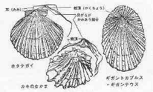 図1:ホタテガイ,カキのなかま,笠形の貝のちがい.