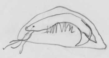 この絵は、写真と一緒に送られてきたものです。質問者の市原さんの同僚の方が、問題の謎の生き物をスケッチしたものだそうです。市原さんは「市原とは別人の手になる絵であること」を明記することを条件に、同僚の方は「あの絵が生物学の進歩に貢献できればこの上の幸せはない」ということで、このホームページで公開することを承諾してくださいました。