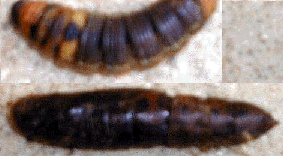 これは、幼虫と蛹の形から,蛾の幼虫だとわかります。校庭のすみから捕まえてきたということから、地面におりて蛹になる蛾の可能性があり、スズメガ類などが該当します。スズメガ類の幼虫であれば、お尻の先にトゲがありますが、残念ながら写っていません。蛹の写真では蛾類の蛹だとわかるだけです。